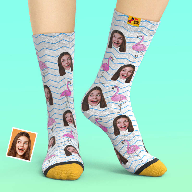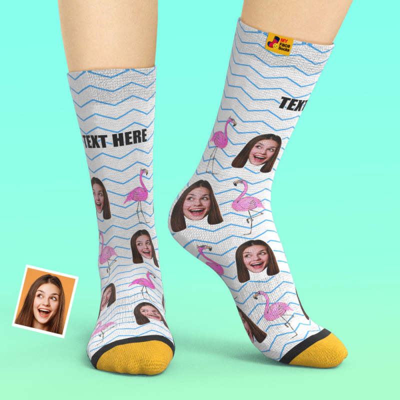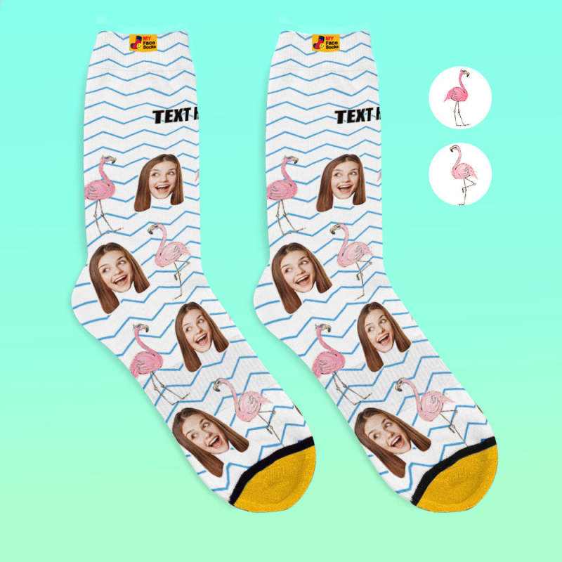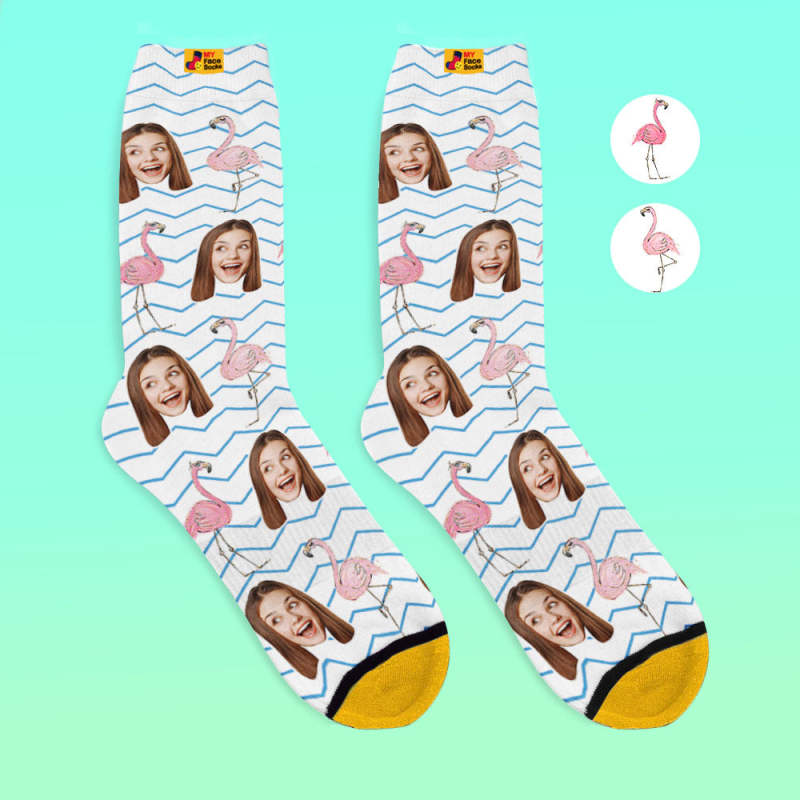 Custom 3D Digital Printed Socks My Face Socks Add Pictures and Name - Flamingos Blue Zig Zag