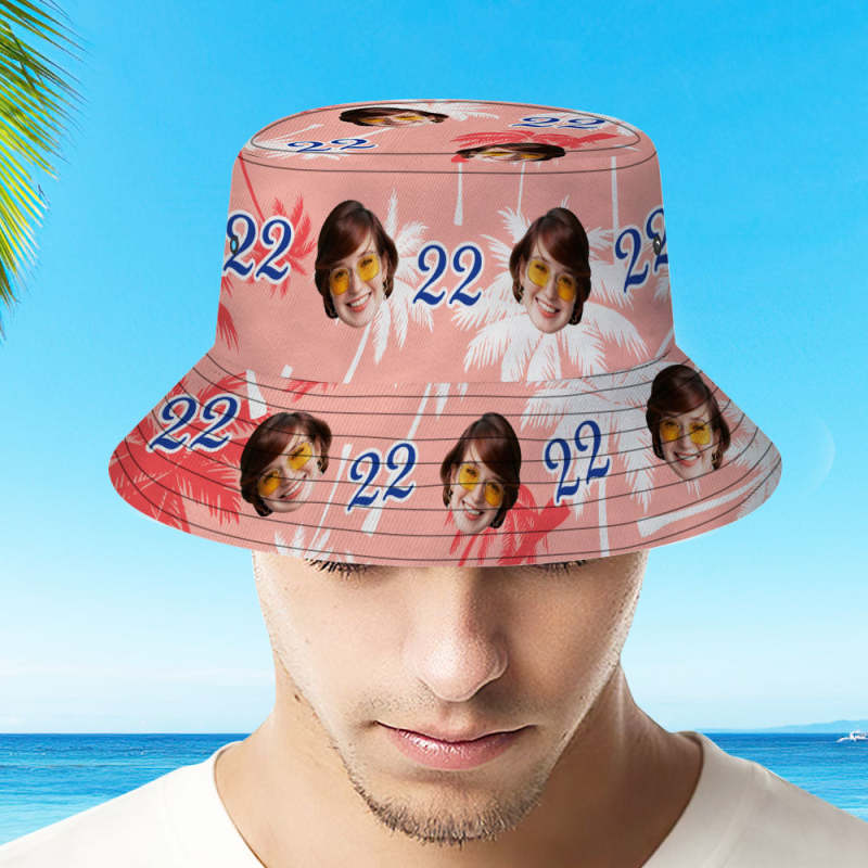 Custom Face And Number Birthday Bucket Hat Red And White Coconut Tree Hat
