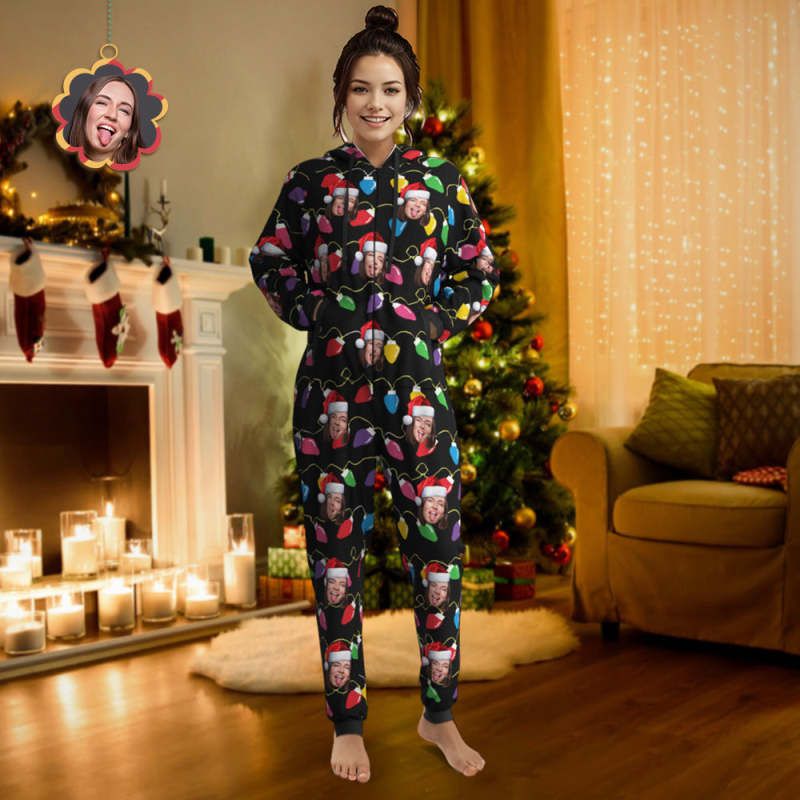 Custom Face Christmas Lights Printed Flannel Fleece Onesie Pajamas Personalized Face Jumpsuit Homewear Christmas Gift