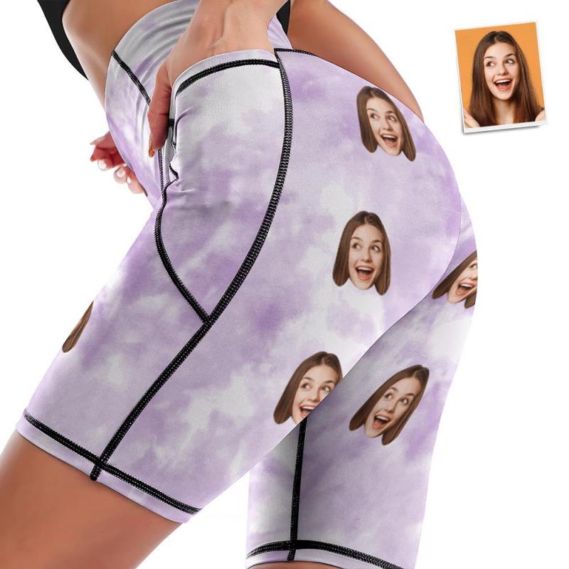 Custom Face Knee Length Tights Women's Yoga Shorts Running Leggings with Pockets - Light Purple Tie dye