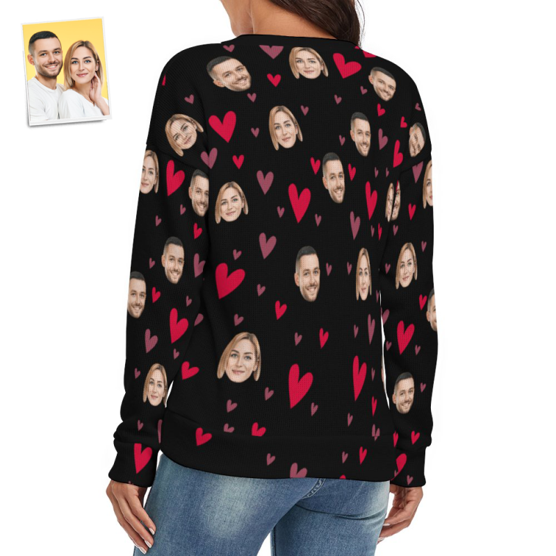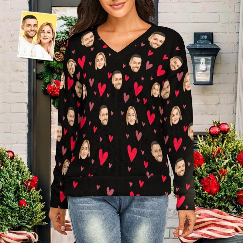 Custom Face Women V-Neck Sweater With Little Heart Couple Theme Spandex Comfortable