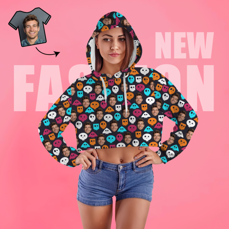 Custom Face Women's Cropped Hoodie Casual Printed Photo Black Pullover - Color Skull