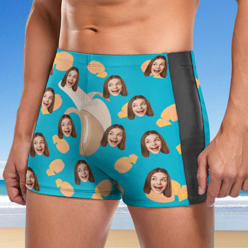 Custom Men's Swim Boxer Shorts, Hawaiian Face Swim Trunks, Peseronalized Swim Briefs - Banana and Cheese
