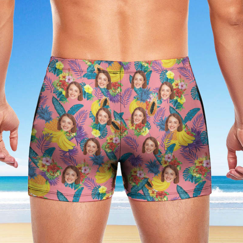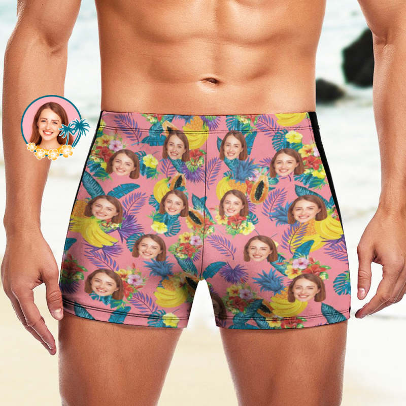 Custom Men's Swim Boxer Shorts, Hawaiian Face Swim Trunks, Peseronalized Swim Briefs - Pink Fruit