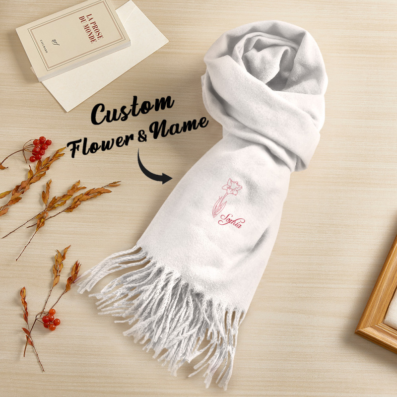 Custom Super Soft Warm Scarf with Embroidered Birth Flower and Text Personalized Fashion Christmas Gift for Couple Family