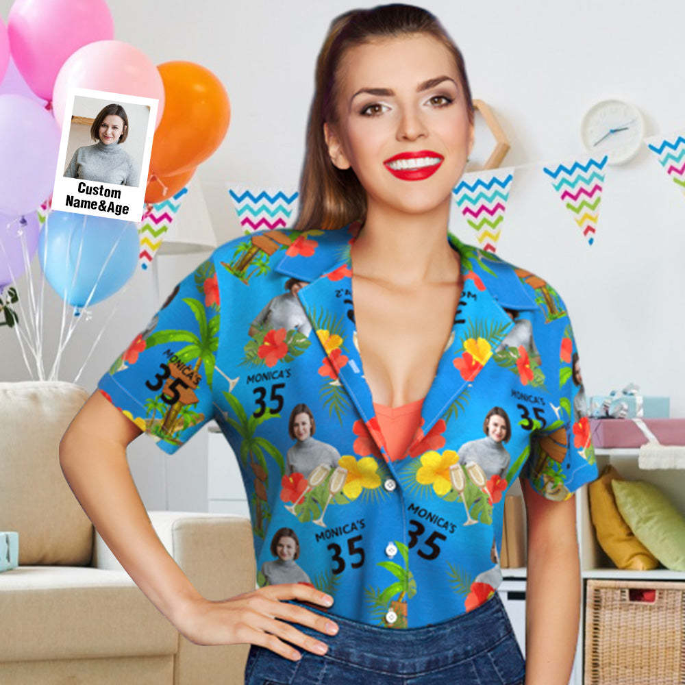 Custom Your Own Face Birthday Blue Women Hawaiian Shirt Custom Age and Name Yellow and Red Flowers Shirt