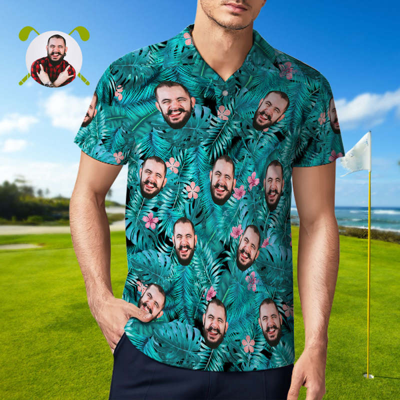 Men's Custom Face POLO Shirt Personalized Blue Golf Shirts For Him Pink Flower